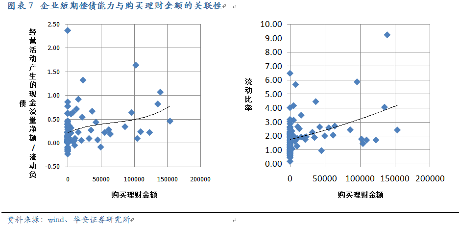 同樣資產(chǎn)負(fù)債率和EBITDA/利息費(fèi)用的高低也與購(gòu)買理財(cái)關(guān)系不明顯。我們可以理解為企業(yè)的長(zhǎng)期償債能力對(duì)購(gòu)買理財(cái)?shù)男袨橛绊懞苄?/span>