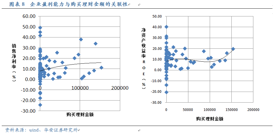 我們考察了上述企業(yè)的主業(yè)的相關(guān)財(cái)務(wù)指標(biāo),包括營(yíng)業(yè)利潤(rùn)、主營(yíng)業(yè)務(wù)比率等,發(fā)現(xiàn)每個(gè)財(cái)務(wù)年度企業(yè)購(gòu)置理財(cái)規(guī)模與當(dāng)期主營(yíng)業(yè)務(wù)水平之間目前并無(wú)明顯聯(lián)系。一方面可能因?yàn)榻y(tǒng)計(jì)期限較短,標(biāo)的公司較少;另一方面,《指引2號(hào)》限制了企業(yè)購(gòu)買理財(cái)?shù)馁Y金來(lái)源及規(guī)模,且只能投向流動(dòng)性較好、安全性高的理財(cái)產(chǎn)品,這意味著作為非主營(yíng)收入的一部分,大部分公司購(gòu)置理財(cái)對(duì)主業(yè)的沖擊有限。