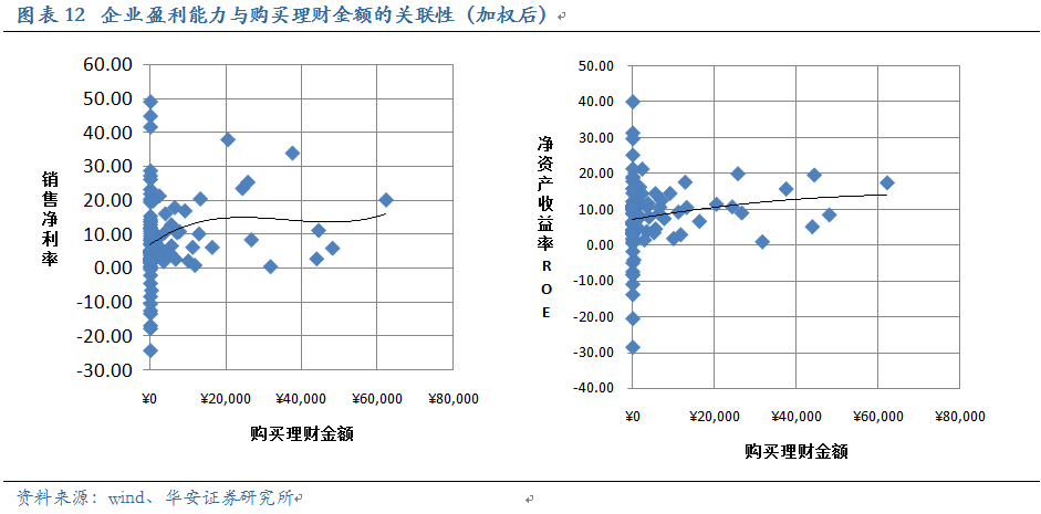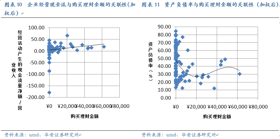 通過(guò)和加權(quán)前的數(shù)據(jù)對(duì)比,我們發(fā)現(xiàn):加權(quán)前,短期償債能力越強(qiáng)的企業(yè),購(gòu)置理財(cái)?shù)囊?guī)模越大,兩者間存在一定程度的線性關(guān)系;而加權(quán)后,原先比較明顯的線性關(guān)系消失了。那些短期償債能力最強(qiáng)、現(xiàn)金流充沛的公司,加權(quán)后的購(gòu)置理財(cái)規(guī)模并不是最高的,而是居于整體的中間位置。說(shuō)明這些公司購(gòu)置理財(cái)?shù)漠?dāng)期規(guī)模雖大,但加權(quán)后的規(guī)模屬于適中,即理財(cái)?shù)拇胬m(xù)期偏短。這種控制理財(cái)期限的方式是值得肯定的。他們放棄了對(duì)長(zhǎng)端收益率的追求,但獲得的是更多的投資機(jī)會(huì),且在一定程度上避免了利率風(fēng)險(xiǎn)。