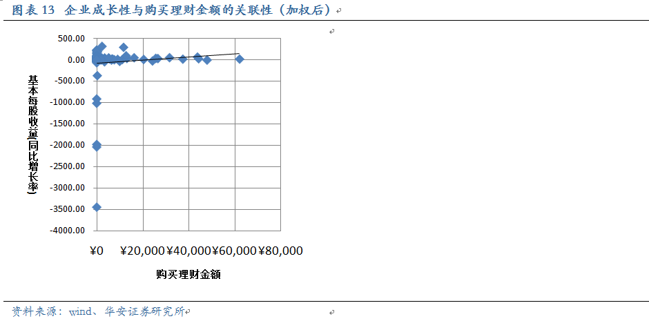 除去個(gè)別幾家公司,理財(cái)產(chǎn)品對(duì)高成長(zhǎng)的公司似乎吸引力不大,購(gòu)買理財(cái)?shù)墓敬蠖嗦湓贓PS增長(zhǎng)在50%~-50%之間,且這個(gè)區(qū)間內(nèi)購(gòu)買理財(cái)規(guī)模與EPS增速?zèng)]有明顯的線性關(guān)系。