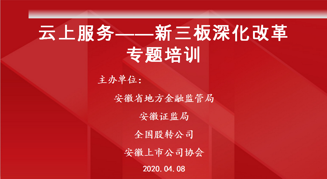 時(shí)值設(shè)立精選層在內(nèi)的新三板深化改革舉措正如火如荼鋪開,為進(jìn)一步幫助安徽新三板公司及時(shí)準(zhǔn)確了解新三板改革動(dòng)態(tài),根據(jù)安徽證監(jiān)局工作部署,4月8日,我會(huì)配合舉辦了新三板精選層制度規(guī)則專題培訓(xùn)活動(dòng)。協(xié)會(huì)新三板工作委員會(huì)委員及安徽110家掛牌公司以及16個(gè)地市的金融局,近200人通過在線形式參加培訓(xùn)。