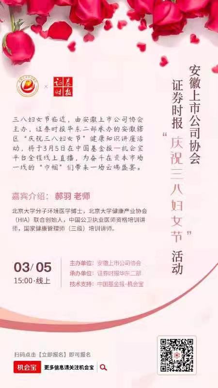 為豐富行業(yè)文化建設(shè),致敬會員單位廣大女性工作者為安徽資本市場高質(zhì)量發(fā)展做出的貢獻,值此“三八”國際婦女節(jié)來臨之際,我會于3月5日舉辦安徽上市公司線上健康講座活動,轄區(qū)30余家上市公司的高管及相關(guān)行業(yè)人士約90余人參加活動。