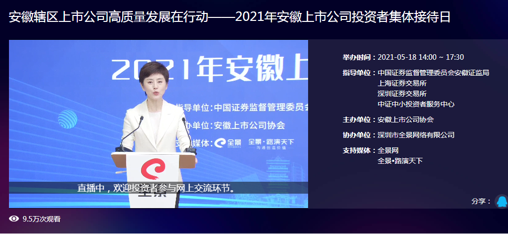 5月18日,我會主辦的“2021年安徽上市公司投資者集體接待日”活動成功舉行,安徽轄區(qū)67家上市公司的近200名董事長、總經(jīng)理等高管通過全景網(wǎng)參與了線上活動,參與、觀看者接近十萬人次。