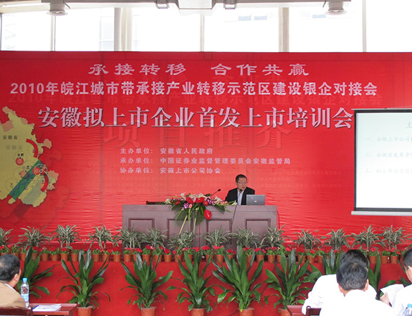 設(shè)銀企對接會(huì)的一個(gè)重要組成部分,由安徽證監(jiān)局承辦、安徽上市公司協(xié)會(huì)協(xié)辦的企業(yè)首發(fā)上市培訓(xùn)會(huì)在蕪湖舉行。參加培訓(xùn)的企業(yè)共有24家,約60人。此次培訓(xùn)會(huì)對進(jìn)一步促進(jìn)企業(yè)上市,發(fā)揮資本市場推動(dòng)結(jié)構(gòu)調(diào)整、承接產(chǎn)業(yè)轉(zhuǎn)移起到了促進(jìn)作用。